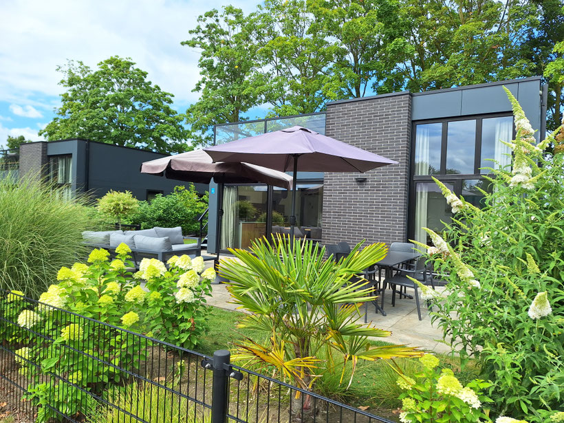 Die mit Garten- und Lounge-Möbel ausgestattete Terrasse vor dem Wohn-Essbereich wirkt durch große Schiebetüren wie eine Erweiterung des Innenbereichs. Ein Holzkohlegrill steht in einem der Abstellräume zur Verfügung. Die mit weiteren Loungemöbeln ausgestattete Dachterrasse ermöglicht einen Blick aufs Wasser und über den Park. Hier ist, wenn sie scheint, den ganzen Tag Sonne.